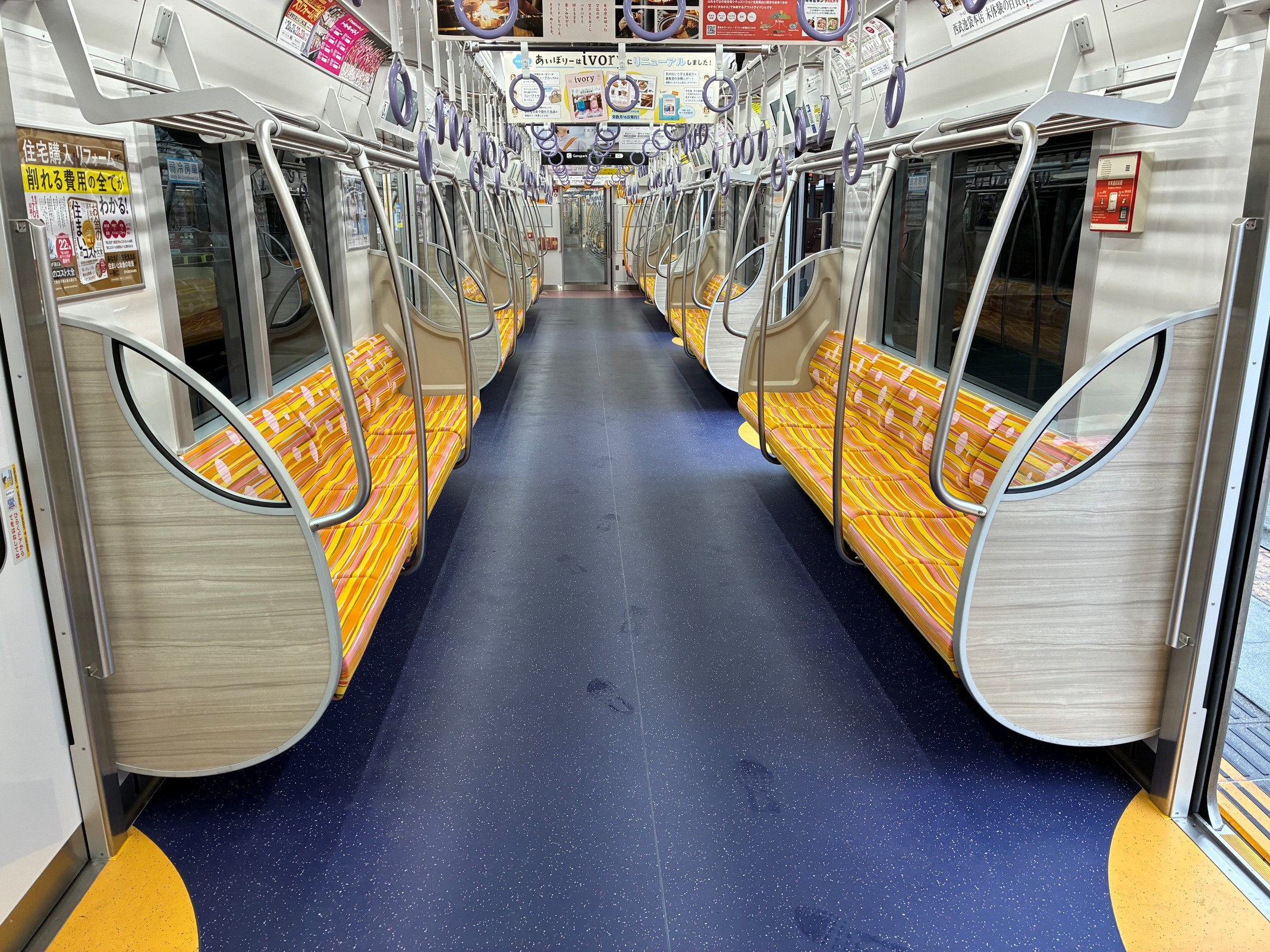 車内。外観同様に円をモチーフとしたデザインとされている。床の色以外は暖色系の配色とされている。